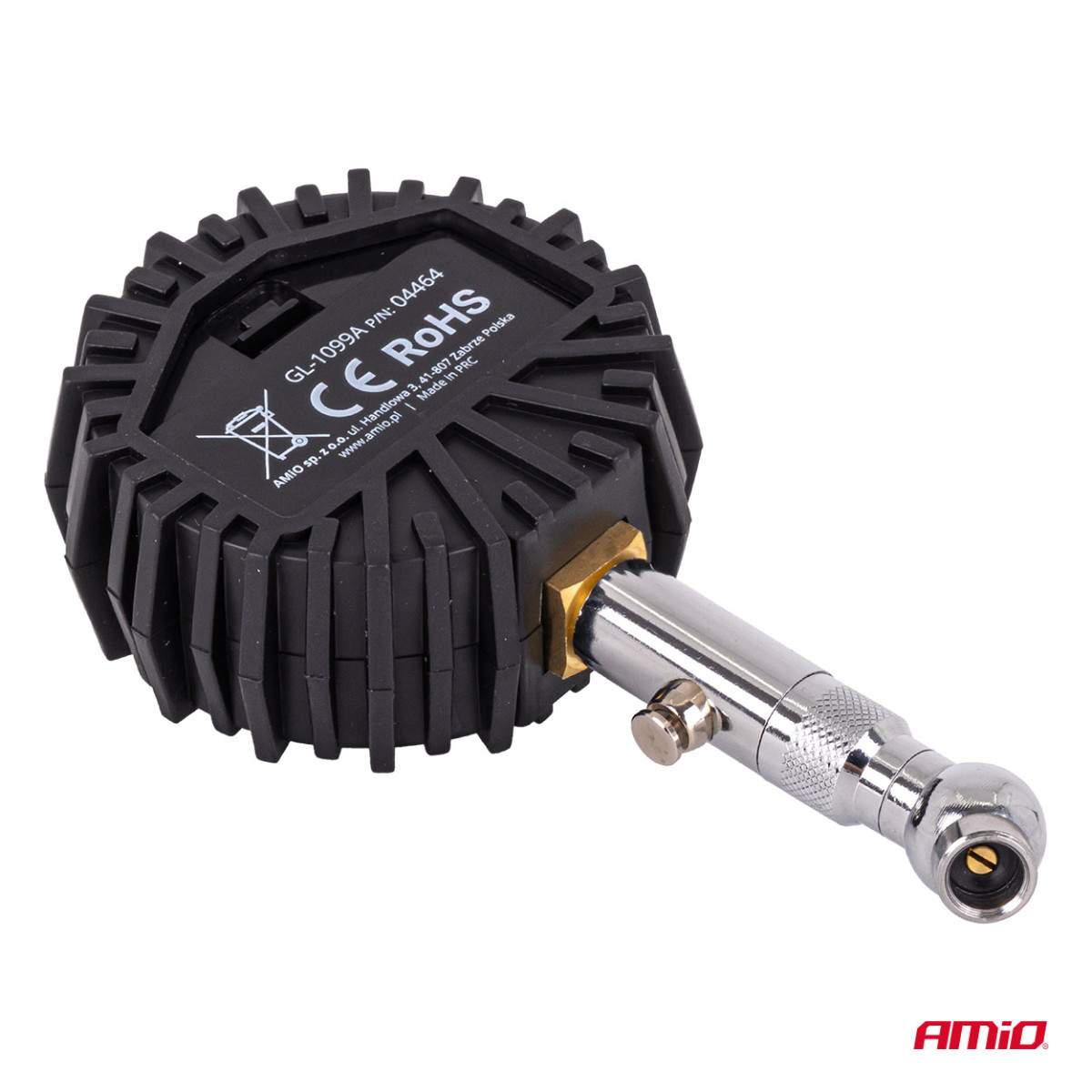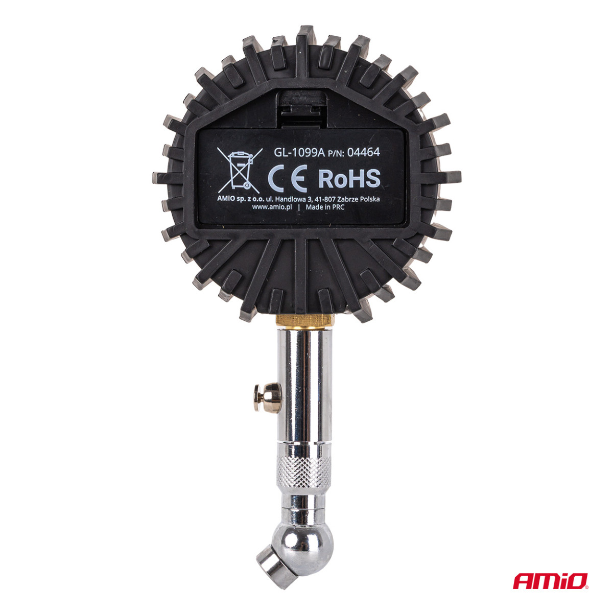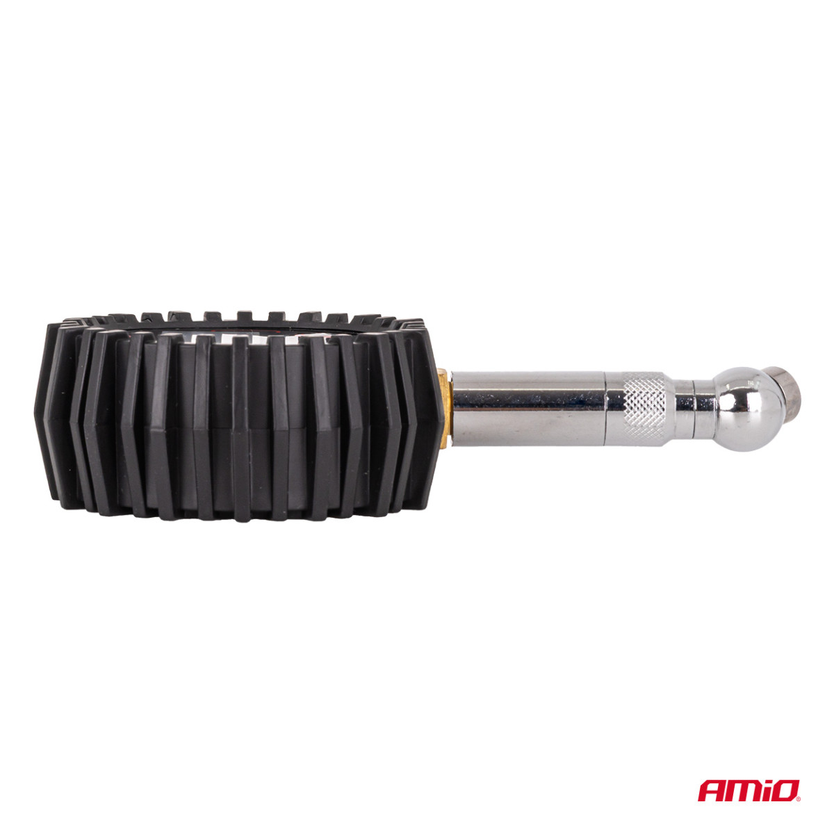 Digital tryckmätare med vridhuvud och luftningsventil – ett professionellt verktyg för att kontrollera däcktrycket. Utrustad med en digital display som säkerställer noggranna och snabba mätningar upp till 17 bar. Vridhuvudet ger bekväm åtkomst till ventiler på svåråtkomliga ställen, och luftningsventilen gör det enkelt att justera trycket utan att ta bort enheten.