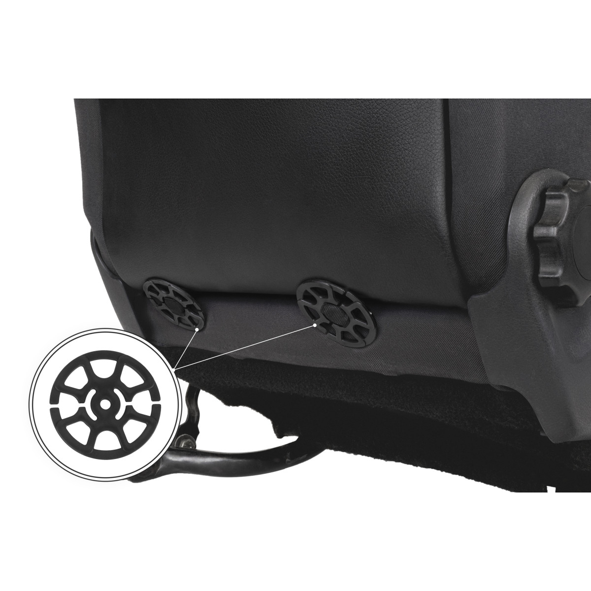 - Framsätesöverdragen fästs under sätet och på baksidan med plastklämmor mellan sittdyna och ryggstöd