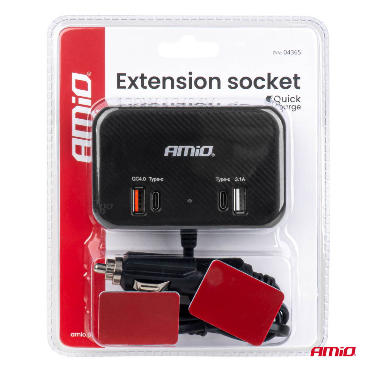 Treuttagsförlängningssladd med laddare 1x USB-A + 1x USB-C QC 4.0 12/24V 120W 80 cm AMIO-04365