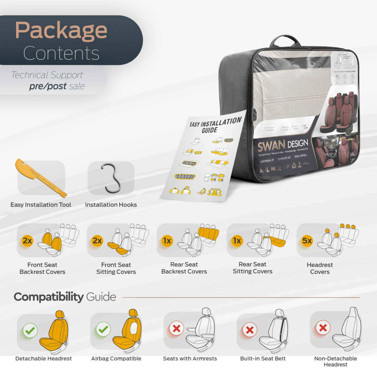 Standardöverdragen är utrustade med en certifierad AIRBAG- söm, vilket gör dem lämpliga för bilar med både sidokrockkuddar i sätena och standardsäten. Tack vare den speciella gängkonstruktionen omsluter överdragen sätena helt utan att störa krockkuddarnas funktion.