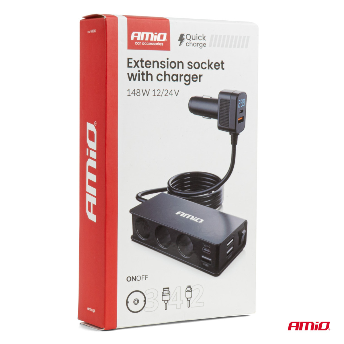 Uttagssplitter 12/24V med 3x USB-A, USB-C, QC3.0, PD3.0 148W AMIO-04836